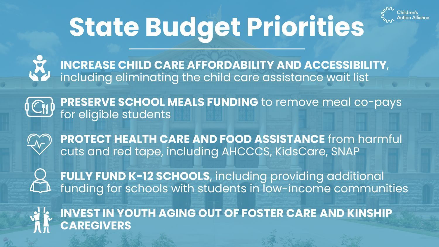State law requires that Arizona pass a budget by June 30 of each year. As the clock ticks towards this deadline, Children’s Action Alliance continues to advocate for priorities that will help grow strong and healthy children in Arizona. We’ve laid out our priorities for children and families, and we’re seeing some positive investments in the bipartisan budget that the Senate Appropriations Committee passed yesterday. This budget framework was negotiated between Governor Hobbs, Senate Republican legislators, and Senate and House Democratic legislators. We need to be sure that priorities for children and families are in the final budget. Click below to learn where our priority issues stand in this latest budget proposal.